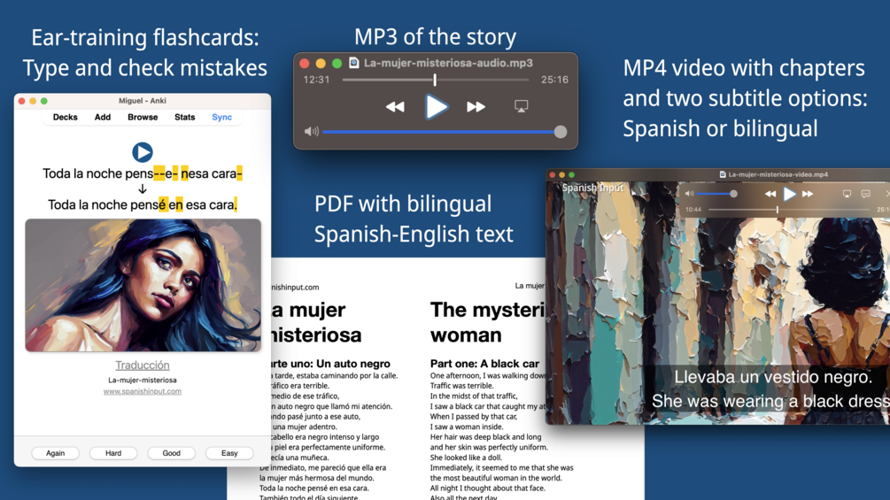 Full Package: This includes everything: The flashcards, the audio in mp3 format, a PDF with the story in both Spanish and English and the video in mp4 format. The video has selectable captions and chapters.