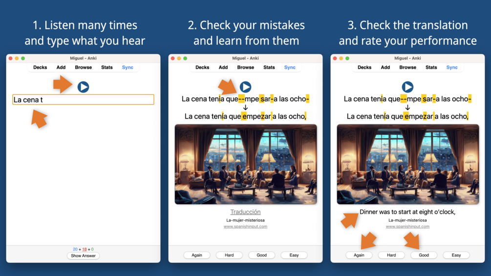 Tired of not understanding Spanish speakers? An effective way to improve your listening is the Transcription Technique, and these flashcards make it easier than ever to use this technique. When you study each card, you'll hear a short audio clip from the story. You'll type what you hear and Anki will then highlight all your mistakes. This will help you a LOT to identify and fill gaps in your listening, vocabulary and grammar.