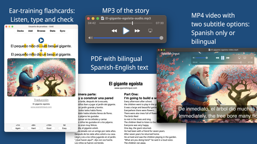 Flashcards + bilingual PDF + mp3 of the story. Great for printing, highlighting and writing notes. Get this option if you prefer to use your own audio player or transcription software. -